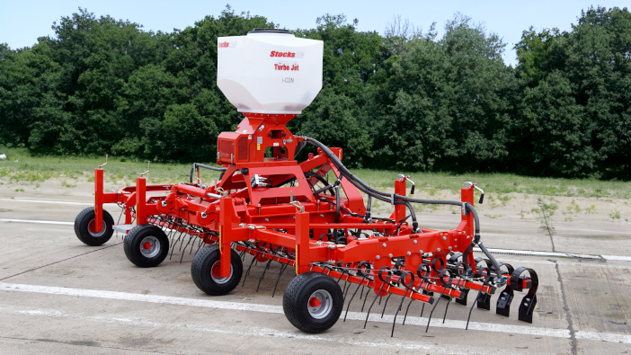 The Grass-Combi can also be fitted with a Stocks Ag Turbo-Jet 8 seed applicator, with a high-output electric fan and the i-CON control system. The unit is available in a 6m working width, folding to 2.5m for transport.