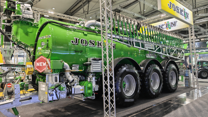 A new flagship X-Trem 2 field tanker was introduced by Joskin. The TX variant has three models, with capacities from 26,750 up to 30,510 litres, each mounted on triaxle running gear. The chassis measures just 800mm, enabling 800/60 R32 tyres to be fitted as standard, and 800/65 R32s to be available as an option while staying within legal road limits.