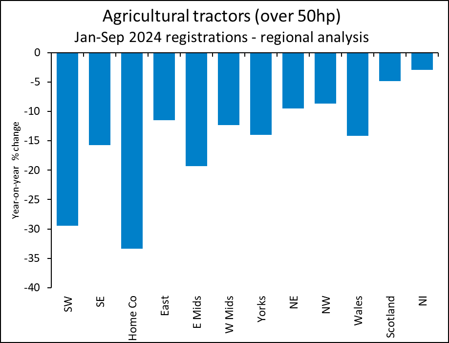 After reporting that tractor registrations were 15% lower from January to September than the previous year, the Agricultural Engineers Association (AEA) has released a breakdown of the figures by power and region.
