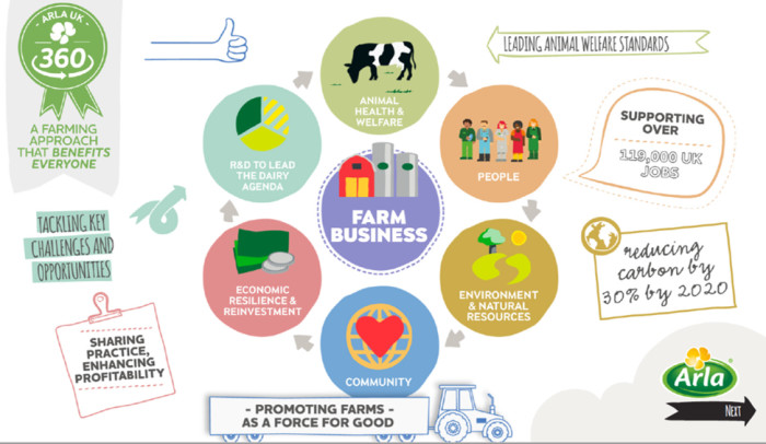 The Arla UK 360 programme covers the six areas essential to building a profitable, responsible dairy farm business. It incorporates best practice in today’s dairy farming across animal health and welfare, people development, environment and natural resources, community engagement and economic resilience and reinvestment, and will then drive a vision for research and development areas that will lead the UK dairy agenda.