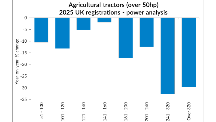 Below 240hp, the overall registrations were down 11%. Interestingly, while it was high powered machines that saw the biggest decline, tractors over 240hp still made up 12.2% of the market, the highest market share recorded.