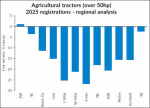 With 2025 registrations complete, the AEA has released the breakdown of registrations by power and region. High horsepower machines saw the biggest decline, with tractors over 240hp down by nearly a third. This contrasts with the 2024 figures, where registrations in the higher power band increased by 19.1%. This indicates the struggles with prices, yields and political pressures that arable farmers have felt.