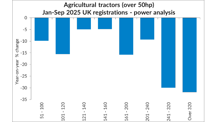 High-horsepower tractors have been the hardest hit in the last nine months, with registrations of 241-320hp down 29.9% year-on-year, and tractors above 320hp down 31.9% compared to the same period in 2024.