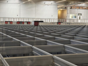 An under-pallet carrier system is used to connect this area to order picking, with ten robots working.