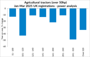 Every power bracket saw a decline of at least 10%, with the most pronounced being the 241-320hp sector. This sector was the best performing in 2024 but dropped from 319 machines in the first three months of that year to just 163 in the same period in 2025 – a drop of 48.9%.