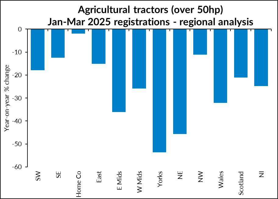 The downturn in agricultural tractor registrations has continued in the first three months of 2025, with the March figure being the lowest recorded since 2016.