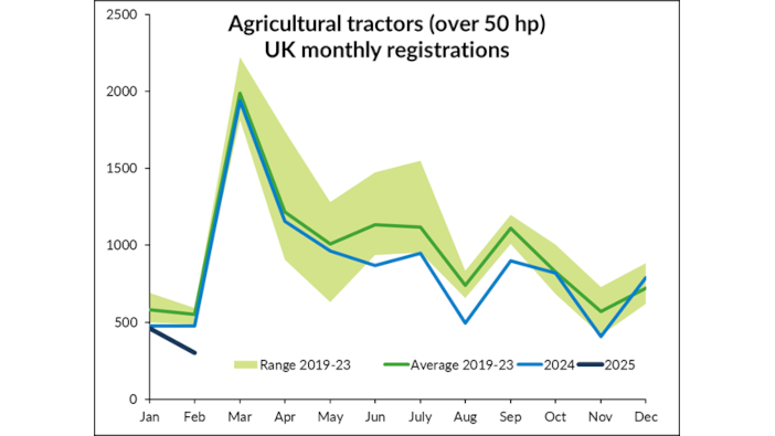 With just 300 units registered, figures for February were 37.1% lower than the same month last year, and just over half of the seasonal average, according to the Agricultural Engineers Association (AEA).