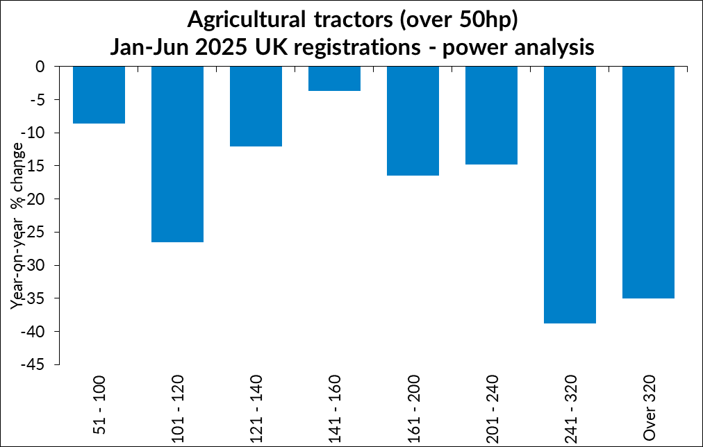 This drop was seen across every power bracket, although the largest drop has been seen in machines over 240hp, which fell 38% when compared to the same period in 2024. This is understandable, as high-horsepower machines were the only sector to grow last year.