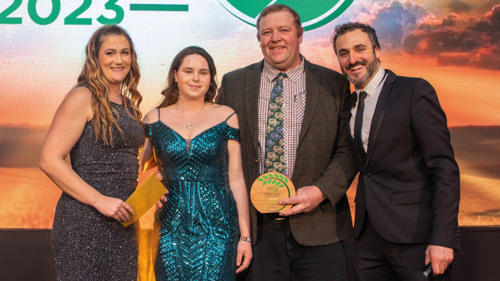 Eleanor Gilbert and Dan Willis collect the Oilseed Grower of the Year aware from Jemma George, Premium Crops and host Patrick Monahan